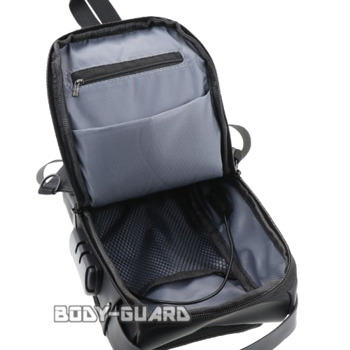 | 収納スペース・機能 | ・メインポケット(ダイヤルロックで施錠可能、ファスナー式の内ポケット付き) ・フロントポケット ・背面ポケット(シークレットポケット) ・小物入れポケット(ショルダーベルト部分) ・USB充電ポート※使用する際は内部のコードにモバイルバッテリー(別売)を接続してください |