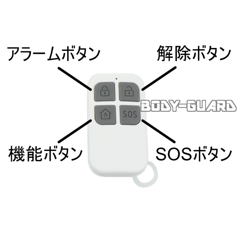 | モード説明 | リモコンとのペアリングが完了した状態で各ボタンを押すと音が鳴りモードが切り替わります。 ※機能ボタンでのモード切り替えは解除ボタンを押してから行ってください ●アラームボタン(ピーと音が鳴る) 本体とマグネットが離れると約30秒間アラームが鳴り響きます。 ●SOSボタン SOSボタンを押すと約30秒間アラームが鳴り響きます。 ●解除ボタン 解除ボタンを押すと、アラームがOFFになります。 ●機能ボタン ・閉め忘れ防止:機能ボタンを押して「ピピピッピピピッ」と音が鳴った時 本体とマグネットが離れている間「ピピピッ」と音が鳴ります。本体とマグネットが近づくと音が止まります。 ・チャイム:機能ボタンを押して「ディンドン」と音が鳴った時 本体とマグネットが離れるとチャイムが鳴ります。 ・アラーム:機能ボタンを押して「ピピピッ」と音が鳴った時 本体とマグネットが離れるとアラームが鳴り響き、本体とマグネットが近づくとアラームが止まります |