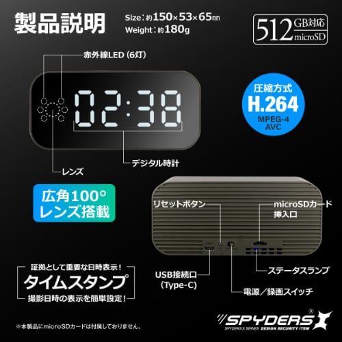 | コメント | 実物見ましたが、レンズの場所は目視できないくらいわからないです。 見た目がただの置時計にしか見えないので、 犯人に怪しまれることなく犯罪の証拠をつかむことが可能です。 またお家にいるお子様やペットの見守りとしてもご使用頂けます。 最大照射距離が約10mは、スパイカメラの中でも高性能なカメラになります。 さらに視野角も広いので、撮影できる範囲が広く優秀です。 スマホなどの連携をする場合は、Wi-Fiの環境や知識が必要になってきます。 予めご了承ください。 |