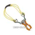 | 商品説明 | このスリングショットは、左右に最大3本のゴムを装着でき、グリップ部が紐で巻かれたユニークなデザインが特徴です。 一般的なスリングショットと比べて、ゴムの交換が容易です。 ゴムは固定部分の隙間に左右から差し込むことで取り付けます。 替えゴムは装着されていない状態で付属し、装着のポイントは「店長より」で確認できます。 |