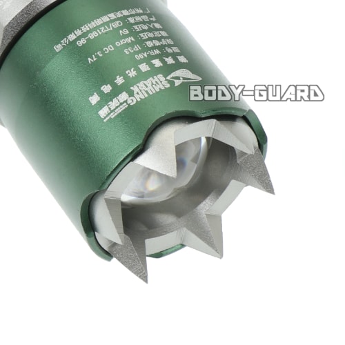 本体先端のライト付近に収納可能なガラス割りがついています。