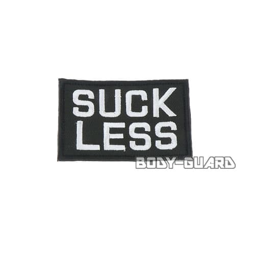 「SUCK LESS」の文字が刺繍されたワッペンです。