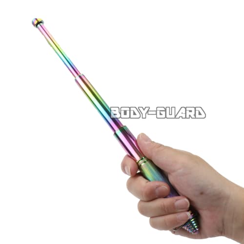 警棒を振って出し、硬い地面に叩きつけて収納します。